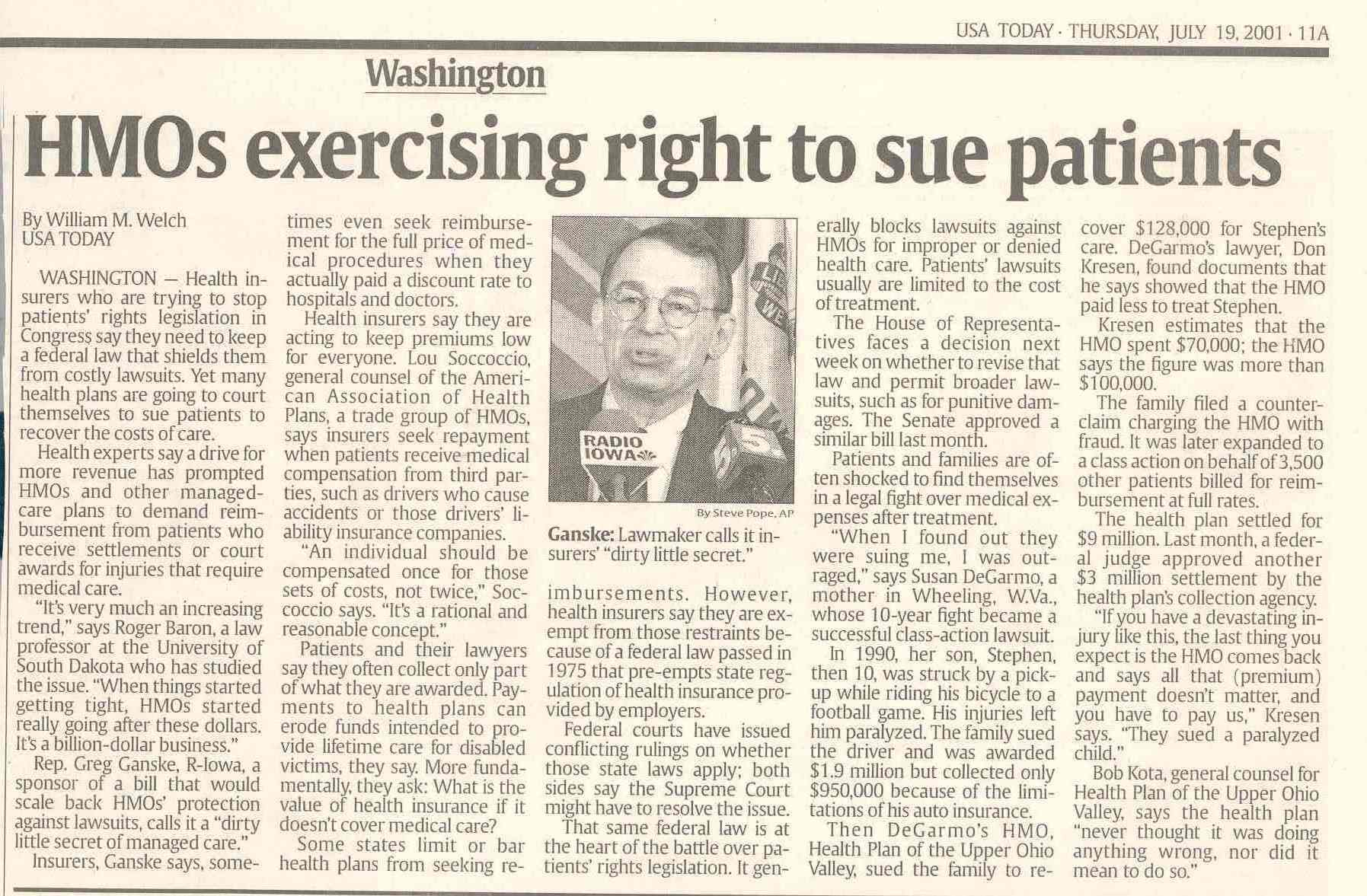 Congressman Greg Ganske, R – Iowa, referred to the health insurers’ efforts to seek subrogation as the industry’s “dirty little secret” in the attached article, “HMOs excercising right to sue patients,” USA Today, July 19, 2001. This article was written during the Senate’s Debate concerning the Patients’ Bill of Rights. I was interviewed and quoted in this article.